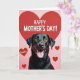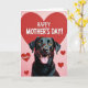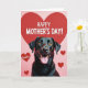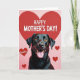 This card features a dark-furred, retriever-like dog centered in the scene, smiling with an open mouth and a pink tongue that makes it look eager to nuzzle close ❤️. Its amber eyes catch small highlights, giving it a tender, friendly gaze that feels like a loyal companion looking up at someone it adores. Near the top sits a large red heart like a backdrop, with a short Mother’s Day message set inside it in white lettering. A few smaller red hearts are scattered around the background, adding the feeling of little affectionate “notes” floating in the air. The background is a soft blush pink, keeping the focus on the dog’s deep black coat and the warm reds. One small heart includes a tiny handwritten-style note in a darker ink, tucked off to the side like a private message between loved ones 🌼. The upper heart is bright red, the text inside it is white, and the smaller hearts dot the pink space around the dog’s head and shoulders.