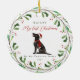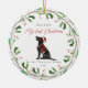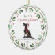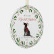 This sweet dog ornament features "my first Christmas in my forever home" typography with pretty red script. Your pet's name is prominent at the top of the design, and is surrounded by a festive botanical and berry painted wreath. The ornament includes a cute pointer black illustrated dog in the center. A beautiful gift for any fur parent!