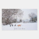 This original little snow scene landscape painting shows two mixed breed dogs, having fun in the fresh carpet of crisp snow. The brown and black dog is accompanied by his friend a german shepherd/ golden labrador cross breed dog, the two of them are gazing across the snow covered landscape to the rooftops below the hill. The two pals have just been playing in the snow covered trees and are taking a little breather from their doggy fun and games. This original picture of two dogs in the snow makes a great square Christmas sticker. This is a customizable sticker, you can personalize it with your own text. The watercolour snow landscape painting is titled "Fun In The Snow" The scene is of a golf course in South Woodford on the edge of East London England.