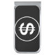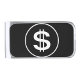 A money clip with a black background and a white dollar sign in a circle. The clip is made of metal and has a shiny finish. The dollar sign is centered on the black background.