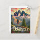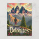 A captivating and nostalgic depiction of hiking in the Dolomites, Italy, showcasing the rugged beauty and dramatic landscapes of the mountain range. The design features hikers traversing scenic trails amidst towering peaks, lush meadows, and alpine lakes. Rendered in a vintage style, the artwork evokes the adventurous and serene experience of exploring the Dolomites, inviting viewers to immerse themselves in its breathtaking natural splendor