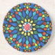 Colorful painting of gemstones in a circular mosaic pattern on a black background, printed on coasters.
