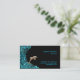 customizable business card template with golden dolphin surfing on a teal blue wave made of paua shell fragments, on black background.