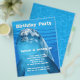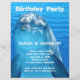 Dolphin face birthday party invitation printed on affordable paper. Perfect for boys or girls celebrating a summer party. Blue water and big dolphin image is the background for custom text in wavy lettering. At the top the text is “birthday party” with a place beneath for the child’s name and age. All party info is added in paragraph form and can include what to bring and how to reply. You may also choose the smaller size.