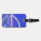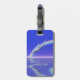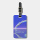 Blue luggage tag with my original 3d creation of a dolphin diving into the water following a rainbow.