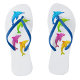 A playful, vibrant flip-flop design featuring colorful dolphins in blue, green, pink, and yellow.