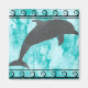 A beautfil watercolor dolphin with blue background and black wave border.