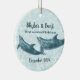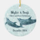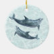 Dolphins ornament for married couple. First married Christmas is the sample wording with names and year date on the other side. Two dolphins swim over a water image on both sides and text is a modern script in sea blue color. Choose the round or square shapes in ceramic or glass. The design will not fit correctly on all shapes. A one-sided ornament will have nothing on the back. Keep all wording away from the edges.