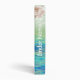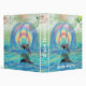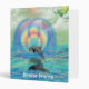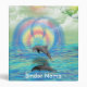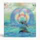 2 dolphins swimming in the ocean near a beautiful rising of colors and water with 2 planets, a moon and a colorful sun. Pink, blue, aqua, yellow and green colors in the water and sky.