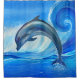Looking for unique dolphin shower curtains and bath accessories that you can personalize? Here is a custom print of a hand painted dolphin jumping out of the sea with large swirling waves to fit your ocean theme / beach theme bathroom perfectly! Artistic and brilliant in blues, sea greens and foamy white... bring a sense of tranquility and rejuvenation to your bathroom, and liven up the space with this happy leaping dolphin painting! Category: unique custom shower curtains with dolphins / painted dolphin shower curtain designs with a large ocean wave. Colors: royal blue, sea green, turquoise, cyan , sapphire, gray and white.