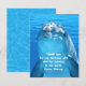 Birthday thank you flat note cards with dolphin face. Wavy, white lettering is used to create a custom “thank you” message which is printed over the dolphin. The back of the cards has a water image. Choose any size card that fits this design.