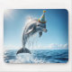 A dolphin joyfully leaps out of the water, wearing a colorful party hat, under a clear blue sky