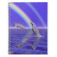 Notebook with my original digital artwork of two happy dolphins leaping out of the water, following a rainbow.