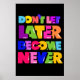 Do it Now. It’s Now or Never. This design features a motivational quote “Don’t Let Later Become Never” that will boost your confidence. This inspirational “Don’t Let Later Become Never” design is perfect for you or anyone who loves to be inspired. Grab it for yourself or surprise your friends, family and colleagues with this inspirational gift. Enjoy!