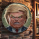 A dartboard featuring an angry caricature of a political figure. The target is in the center of the face, aiming for the nose.