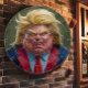 A circular dartboard featuring a caricature of a man with blonde hair and an angry expression. The mans face fills the entire board, and his eyes are wide with green pupils. He is wearing a suit and tie, and his mouth is open in a yell.
