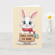 Designed with a soft cream background, this card features an upright cartoon bunny with bright white fur, pink inner ears, and a tiny nose, gazing out with large blue eyes that feel a little tired yet endearing 🐰. Long lashes and a gentle tilt of the head add a friendly, almost “please understand” look, like it’s sharing an inside joke with someone close. Around its neck sits a red scarf dotted with small white circles, adding a cozy touch against the pale setting. The bunny holds a rustic wooden sign made of simple planks, centered in front of its body as if it’s presenting a message to a friend. Across the sign, the phrase “CANCEL EASTER, I’M DONE” appears in brown, all-capital lettering that stands out against the wood grain. A fluffy tail peeks from behind the sign, and a blue-and-white patterned oval tag dangles from one corner for a small decorative flourish 🌷. The lighting stays bright and even, and the sign’s brown text sits squarely across the middle of the wooden boards.