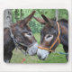 A photo of two friendly brown grey donkeys touching noses with a background of grass and trees. They look very cute with their ears forward and white rings around their gentle eyes. The photograph was taken at a show in France where donkeys are very popular.