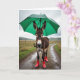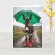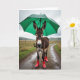 This card shows a deep-brown donkey centered on a wet, muddy lane, with a soft white muzzle and dark, steady eyes that meet yours like an old friend. An emerald umbrella opens above its head, adding a bright splash of green 💚 against the gray, clouded sky and the distant, rounded hills. The donkey’s stance feels devoted and patient, as if it’s waiting for someone to walk up the path and share the shelter. Each hoof wears a glossy red Wellington boot, and that unexpected detail makes the scene feel tenderly funny without losing its calm mood. Diffused daylight glints on puddles along the track, and the curve of the road leads your eye toward the quiet countryside beyond. The greeting text sits near the top in white letters, spaced neatly against the darker sky for easy reading. A small clover accent ☘️ appears beside the words, echoing the umbrella’s green while the red boots stand out at the bottom of the frame for a friendly burst of color, and it’s a lovely way to share St. Patrick’s Day sentiments.