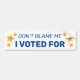 Don't take that opposition candidate bumper sticker off of your car -- leave it loud and proud and add this companion sticker to show others how you voted in the last election. Share your original and continued support for your preferred candidate with this "helper sticker" that adds the text "Don't Blame Me I Voted For"... to your existing political bumper sticker. From national elections to local races, this bumper sticker is the perfect companion to your political candidate bumper sticker collection.