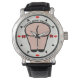 Hee! Hee! This funny watchface pictures a human derrierre to illustrate the caption in an arc above it reminding us "Don't Get Behind - Stay On TIme". Bright Red kiss marks 12, 3, 6 & 9 o'clock. Black arrowheads mark the remaining hours. BONUS 2 custom text fields for your initials.