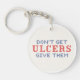 Don't get ulcers, give them! Fun advice stitched in retro cross stitch embroidery needlework on white Aida cloth background.