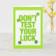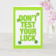 This greeting card centers on the stacked, uppercase line “DON’T TEST YOUR LUCK,” set in bright lime green against a white background 💚. The letters carry a lightly worn texture, giving the message a lived-in look rather than a flat, digital feel. A thick lime-green border surrounds the white center, pulling your eyes inward like a lively frame. Two pairs of four-leaf clovers in deeper emerald green sit in opposite corners, like quiet companions watching over the warning ☘️. The strong contrast between the green tones and the white space creates a flirty, teasing tension, as if the card is daring a close friend to grin and lean in. The text sits centered and vertical in the middle of the white panel, with generous spacing that keeps each word easy to read. The background stays plain and bright, letting the green border and clovers do the decorating. The corner clovers appear diagonally opposed, with crisp edges and a darker green shade than the main lettering.