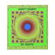 The image prominently features the uplifting phrases "DON'T WORRY" at the top and "BE HAPPY" at the bottom. At the center lies a vibrant, circular kaleidoscopic pattern, framed by a bold green square adorned with small blue circles at each corner. The entire design is set against a bright green, textured background, creating a balanced and centered composition that draws the eye.