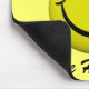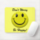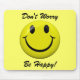 'Don't Worry Be Happy!" with a shining, classic happy face button in original, traditional yellow with bold black features. Background is a light yellow color that adds to the cheerfulness. Put on a happy face with this bright mousepad! A great reminder to keep smiling, even if you're having those dreaded computer problems! A fun and happy gift!