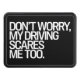 This hitch cover features the humorous phrase "Don't Worry, My Driving Scares Me Too" in bold white text against a sleek black background. Perfect for drivers who embrace their quirky driving style and want to share a laugh on the road. Its minimalist design ensures easy readability while adding a fun touch to your vehicle. Ideal for those with a sense of humor about their driving!