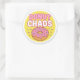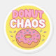 A playful round sticker featuring a pink frosted donut with colorful sprinkles and bold bubble text that reads “Donut Chaos.” Perfect for laptops, water bottles, and notebooks — a sweet reminder to embrace the mess with flavor.