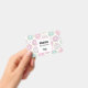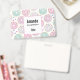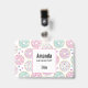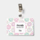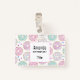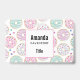 Name tag with a deliciously fun pattern. Illustration of pastel pink and green donuts with sprinkles and icing.