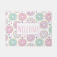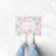 Welcome doormat with a deliciously fun pattern. Illustration of pastel pink and green donuts with sprinkles and icing.