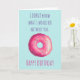 A birthday card with a donut pun which says : "I DONUT know what i would do without you. Happy Birthday." A yummy illustration of a pink frosted donut with colorful sprinkles. Set on a retro blue colored background.