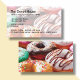 Cool and colorful donut shop business card template he signed with graphic image of donuts in the background lightly printed so that your text information shows up on the front with the full color image on the back of the car. For a doughnut or pastry shop.