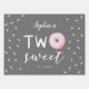 Cute donut theme birthday party yard sign featuring a pink glazed doughnut on a grey background with colorful sprinkles. The text says "two sweet" Great for a girl's 2nd birthday.