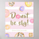 A fun party sign perfect for a donut wall, display, bar, or dessert table that features donuts. This design features pastel colored watercolor donuts on thick baby pink stripes, with a punny phrase - 'Donut be shy' in faux gold hand lettered style font. The message at the bottom of the sign is editable.