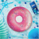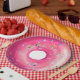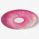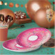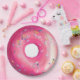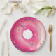 Fun paper plates with a yummy illustration of a big pink frosted glazed donut with colorful sprinkles.