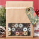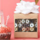 A photo of doughnuts, flavors include maple glaze with bacon sprinkles, powdered sugar, chocolate, coconut and nut sprinkle.