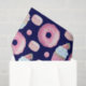 Sweet treats - Donuts with pink glaze icings, cupcakes in dark pink and white paper cups with pale pink or white icing and topped with strawberries or icing flowers and pale pink macarons in a repeating pattern on very dark blue.