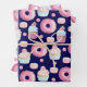 Sweet treats - Donuts with pink glaze icings, cupcakes in dark pink and white paper cups with pale pink or white icing and topped with strawberries or icing flowers and pale pink macarons in a repeating pattern on very dark blue, white and pale blue.