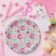 A yummy set of paper plates with a delicious pattern design. Glazed pink donuts with sprinkles. Mouth watering cupcakes in pink and blue with rosettes and strawberries on top. Some pastel pink french pastry macarons and little pink candy buttons also decorate this pattern full of sweet treats.