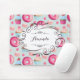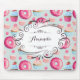 A sweet and whimsical personalized mousepad. design. Glazed pink donuts with sprinkles. Mouth watering cupcakes in pink and blue with rosettes and strawberries on top. Some pastel pink french pastry macarons and little pink candy buttons also decorate this pattern full of sweet treats. In the center a fancy whimsical frame with a hand drawn look to it. Personalize the center with a name.