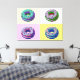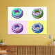 A retro style pop art of four colorful frosted donuts with sprinkles in vivid colors on pastel backgrounds for foodies. Makes a perfect kitchen wall decoration.
