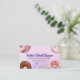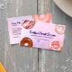 An assortment of doughnuts arrange along the sides of this business card that can be used for a baker, bakery, donut shop, or cafe. The background is a multi-tone watercolor wash with splatters of watercolor paint and faux gold glitter. Available with matching products.