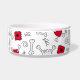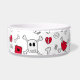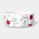 Personalized pet bowl for dogs or cats with cute and whimsical illustrations featuring hand-drawn doodles, bones, skulls, red hearts and custom pet's name.