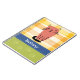 Cute notebook for cat lovers. On a yellow and orange watercolor check background is an orange doodle kitty cat. Below him is a blue band with white lettering to add your name or other text to personalize. Below is a green space with light green paw prints.