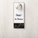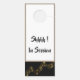 This door hanger is double sided and in black and white with a gold colored stream of notes on staff. at the bottom. Upper edges surrounded by a silver-gray border with sample text of "Shhhh ! In session". Customize this item to your liking with what ever color or phrase you wish, or buy as designed.