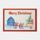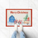 Fun country Christmas doormat with tractor pulling a wagon full of Christmas presents and Christmas tree. All in front of the homestead barn.