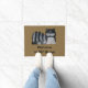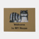 Striped Cat, black and white. Painting of the cat is posed laying with tail curled and head alert. Long hair shows in fluffy tail and face. Text beneath may be customized (defaults to "Welcome to MY House")